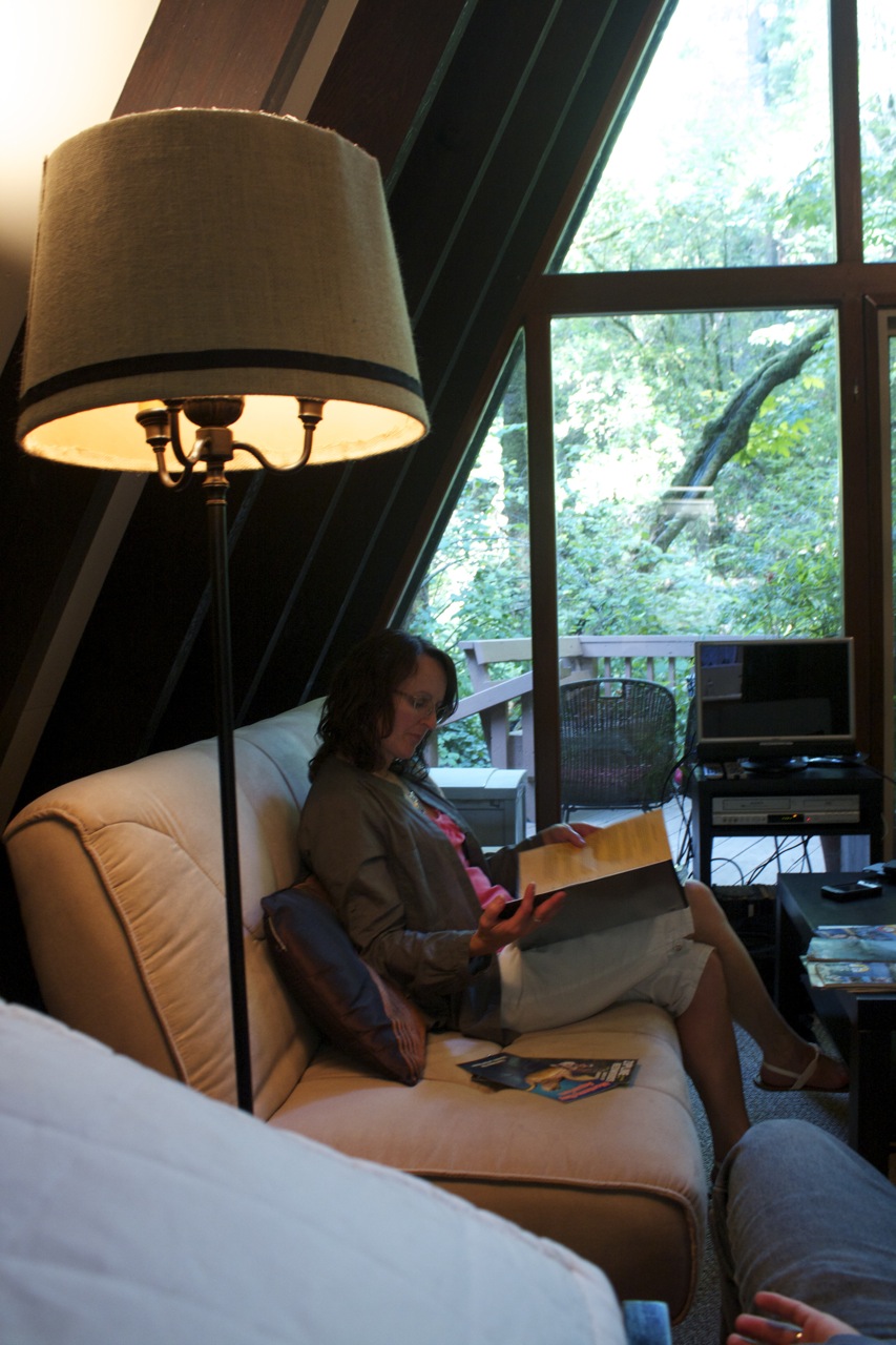 他们租了一间树林里的小木屋,屋边有个小溪。早上把窗户打开,还可以听见流水声,真放松。屋子只有两层。一进门就是厨房,然后客厅隔了一个角落有个单人床,还有洗手间和冲凉房。客厅靠落地窗有个旧式的火炉喔!晚上冷了可以升火取暖。楼上就只有一个双人床和洗手间。屋子前面的小院子有几个烧烤炉,屋后院子有休闲椅子和小桌子。有个早上我们就坐在这里喝热可可,享受小溪的流水声。